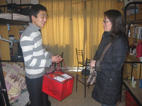 (图为学生工作部部长郁萍老师亲自为春节留校学生送上新春大礼包。)