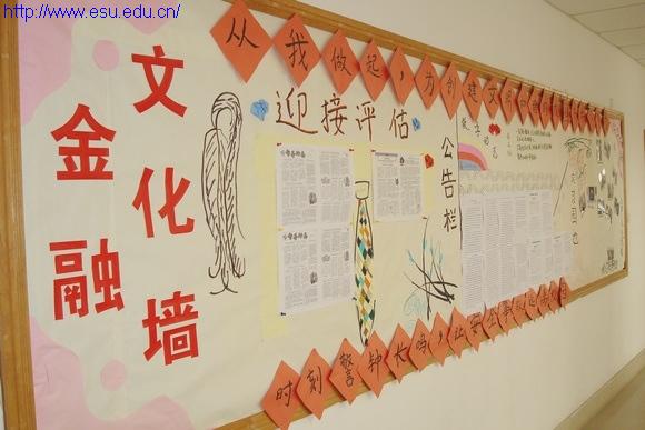 “金融文化墙”作为金融系的专用宣传栏,在迎接学校评估之际,也彻底进行了一次改头换面,不仅以评估为主题,还新增加了“实习园地、学生风采、教学信息”等版面,并且附上了各种活动和系里老师走访学生实习单位的照片,这既丰富了文化墙的内容,又加大了对学校各种信息的宣传力度。自从更新宣传栏后,同学们也能及时的通过这个窗口了解到学校的评估信息和教学上的动态。美观大方、内容丰富的宣传栏,吸引了许多同学的关注,有力地推动了学校文明创建工作。