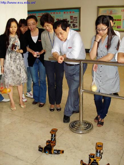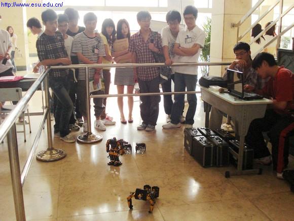 机器人展示得到了机电工程系主任杨萍老师的支持并在工程训练中心乔堋老师的协助下,机器人展示由王银月老师现场指导,机电工程系学生现场操作。机器人会随着指令做出不同的动作,经过的师生都纷纷被机电系学生亲手制作以及编程的机器人及机器小车所吸引,驻足观看。校级领导也对学生能自己动手制作机器人给予了充分肯定。