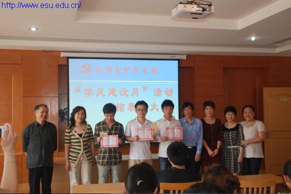 首先由党支部书记朱幼华同志为整个活动作了回顾和总结,最后她满怀深情地说;经过支部全体师生3个月的共同努力,学风建设月活动收到一定效果,各系学风都有不同程度的好转,学习氛围有所增强,迟到、旷课现象明显减少,上课吃东西现象也基本杜绝,宿舍文明卫生环境有了显著改观。结合创先争优活动,经各系评选,数控101、计技101、金融101、护理104为学风建设优胜班级,支部给4个班级颁发荣誉证书和一定奖励。