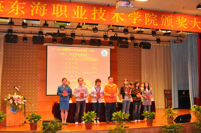 颁奖大会由学生工作部部长郁萍主持。党委书记赵佩琪宣读上海东海职业技术学院《关于颁发2010-2011学年国家奖学金、国家励志奖学金、上海市奖学金及2011-2012学年第一学期校奖学金的决定》,主席台领导为获奖学生颁发荣誉证书。国家奖学金获奖学生代表报关091班苏洁、国家励志奖学金获奖学生代表国商091班徐志强、第一届新疆少数民族学生奖学金获奖学生代表护理114班买热哈巴·玉苏莆等同学在颁奖大会上代表获奖同学发言,表示今后将继续奋发努力,百尺竿头更进一步。