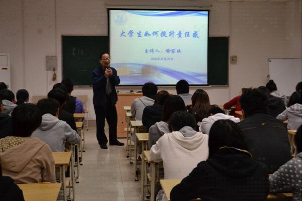 喻老师首先用德国哲学家康德的话开场:每个有价值的人,都有其所应承担的责任。他从理论到现实,指出人们在生活中责任的重要性,使同学们真切了解到每个人都应有自己的信仰、追求,无论是在学校,还是在社会获得“权力”的同时,不能勇于承担责任就将被淘汰。之后,喻老师又指出现今大学生缺乏责任意识的现象,并详细分析了其产生的可能原因和提升大学生的责任意识迫切性与重要性。