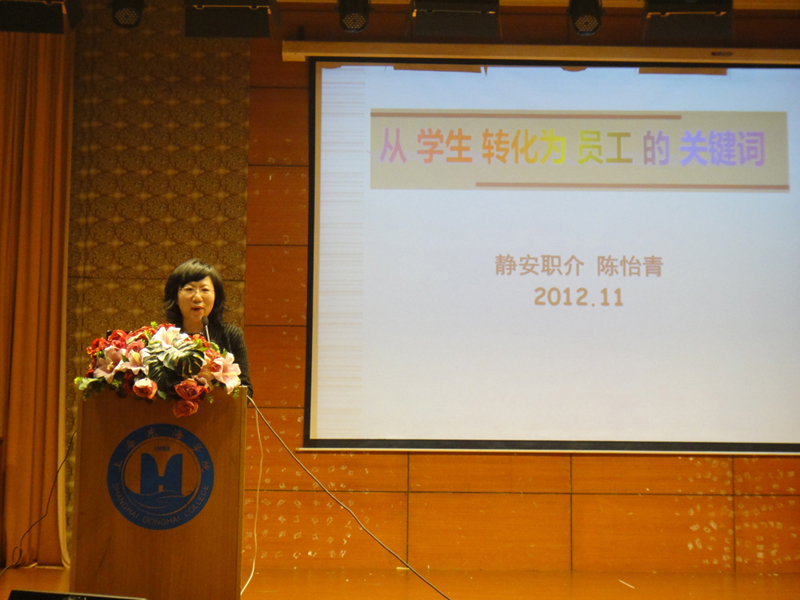 由中共上海市委宣传部、上海市社会科学界联合会主办,上海市人力资源和社会保障局举办,上海市就业促进中心、上海东方宣传教育服务中心、上海市社区文化服务中心和上海图书馆讲座中心等单位承办,以疏导青年职场困惑,关注青年职业生源为宗旨的“2012东方讲坛·职业生涯系列讲座活动”,于11月7日晚在我校图文信息大楼报告厅隆重举行。来自上海市职业介绍静安分中心资深职业指导师陈怡青女士,她以《从学生转化为员工的关键词》为题,向东海学生传授初入职场的适应方法。