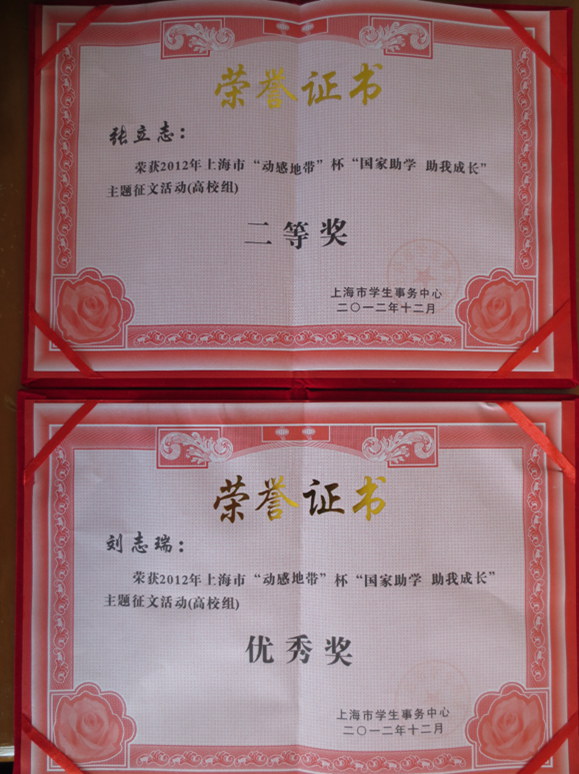 为深入宣传贯彻党和国家资助家庭经济困难学生政策,加强对学生的励志感恩教育,全面展现家庭经济困难学生资助工作取得的成绩,2012年底,我校受助学生积极参加上海市教育委员会组织开展的“动感地带”杯“国家资助 助我成长”主题征文活动,共收到投稿作品50余篇。经学校初审,选送优秀作品参加组委会专家评审,经管学院报关121班学生张立志的作品《在这充满爱的国度》获得二等奖,商贸学院商日101班学生刘志瑞的作品《无声资助,有声回报》获得优秀奖。在此次征文活动中,我校组织工作得力,获得“优秀组织奖”荣誉称号。