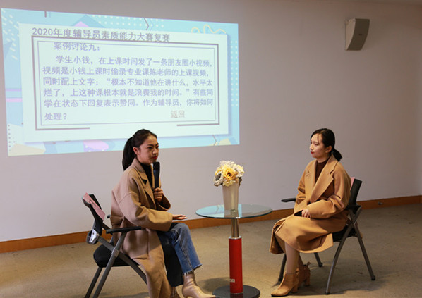 12月10日,我校2020年度辅导员素质能力大赛复赛举办。大赛由党委副书记王玉、学工部部长杨瑾、社科部副主任龙燕、学工部副部长王莉娜担任评委,各二级学院学工办公室主任及全体辅导员观摩比赛。