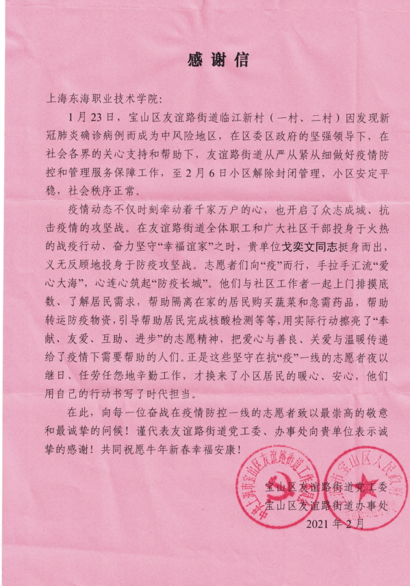 日前,我校收到了宝山区友谊路街道党工委、街道办事处发来的感谢信,信中对我校学生戈奕文义无反顾参与宝山区友谊路街道防疫攻坚战的事迹表示感谢。