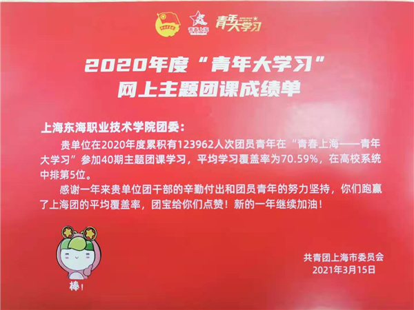 2020年,校团委带领广大团员青年强化思想政治引领,始终坚持中国共产党的领导,以习近平新时代中国特色社会主义思想为旗帜,认真跟从青年大学习的学习,在青年大学习中学习新思想,提升自己,响应中国共产党。以我校2019—2020学年19级各团支部的学习状况为例,有百分之九十班级的青年大学习得分达到90分以上。其中,航空学院空乘194班、民航191班,护理学院护理191班,教育学院学前191班都取得了100分的好成绩。同时,在2020年度,我校有123962人次团员青年在“青春上海——青年大学习”中参加40期团课学习,平均学习覆盖率为70.59%,在高校系统中排名第五。
