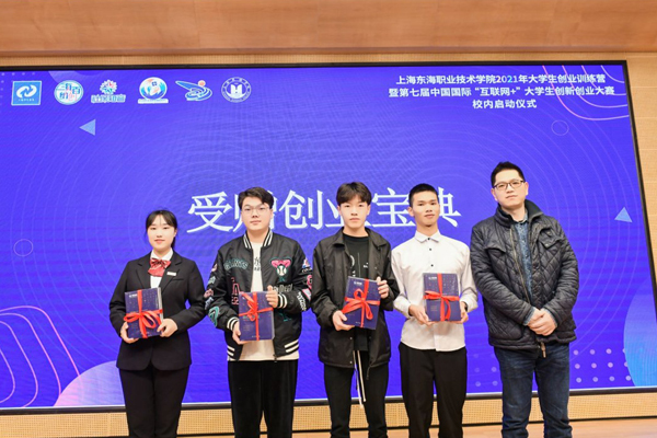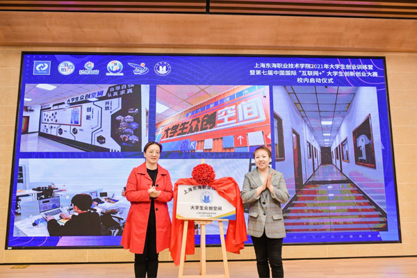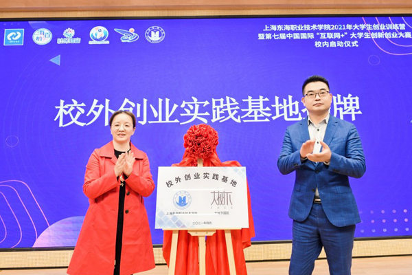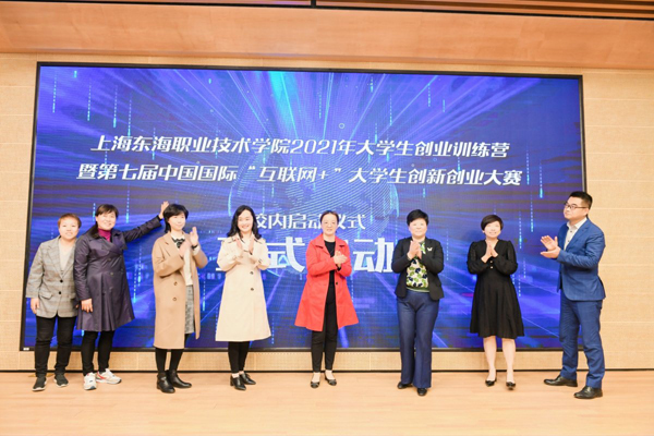 在激动人心的乐声中,上海市学生事务中心、闵行区就业促进中心、吴泾镇社区事务受理服务中心、学校以及合作园区的领导共同上台,正式开启了上海东海职业技术学院2021年大学生创业训练营暨第七届中国国际“互联网+”大学生创新创业大赛校内选拔赛。
