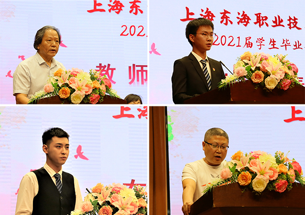 经管学院报关191班郭宸、航空学院民航192班王金鹏分别作为毕业生代表和在校生代表上台发言。机电学院毕业生余尧继的父亲作为家长代表上台向学校和领导老师们表示了感谢。
