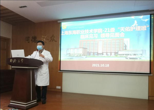 活动伊始,护理部主任刘玮琳主持了“上海东海职业技术学院——21级天佑护理班临床见习领导见面会”,院长蔡剑飞和执行院长王强相继发言,表示了对天佑护理班热烈的欢迎及殷切的期望,天佑集团护理部总监、主任唐秀花对学生提出见习要求,并宣布设立《天佑护理班》奖学金和实习津贴,希望学生们可以学有所得,学有所获。