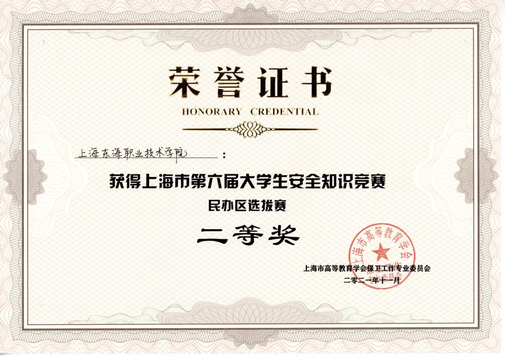 为全面贯彻落实总体国家安全观,进一步巩固上海市高校安全教育成效,推动大学生安全教育向纵深发展,11月6日,由上海市教育委员会主办的上海市第六届大学生安全知识竞赛民办区选拔赛在上海视觉艺术学院举行。由艺术设计学院的辛天泽、陆宇琼、马小艳、张雨荷、季玉豪五名同学组成的上海东海职业技术学院代表队在此次比赛中取得佳绩,荣获二等奖。