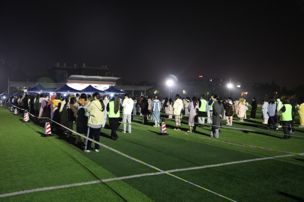 身着蓝色防护服的医护人员顾不上休息,坚守岗位,为师生进行核酸检测。“一抹天使白”成为这个初春的夜晚东海校园里美丽的风景。“‘白衣天使’你们辛苦了,有你们在,我们安心!” 师生们纷纷表达着内心的感激。