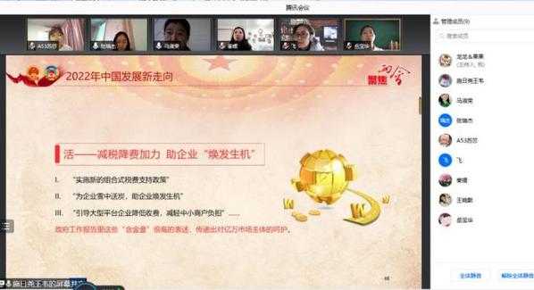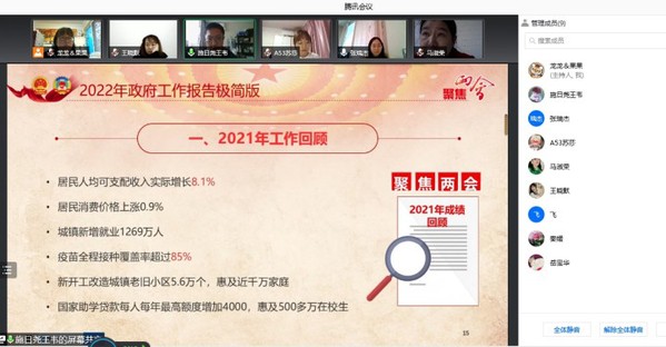 3月18日,社科部教师们虽然都被封控在各自小区,但学习的热情不减,在周五下午通过腾讯会议的形式组织开展了“聚焦2022全国两会”的学习会。学习会由主任龙燕主持,施晓玮老师领学,全体教师参加。