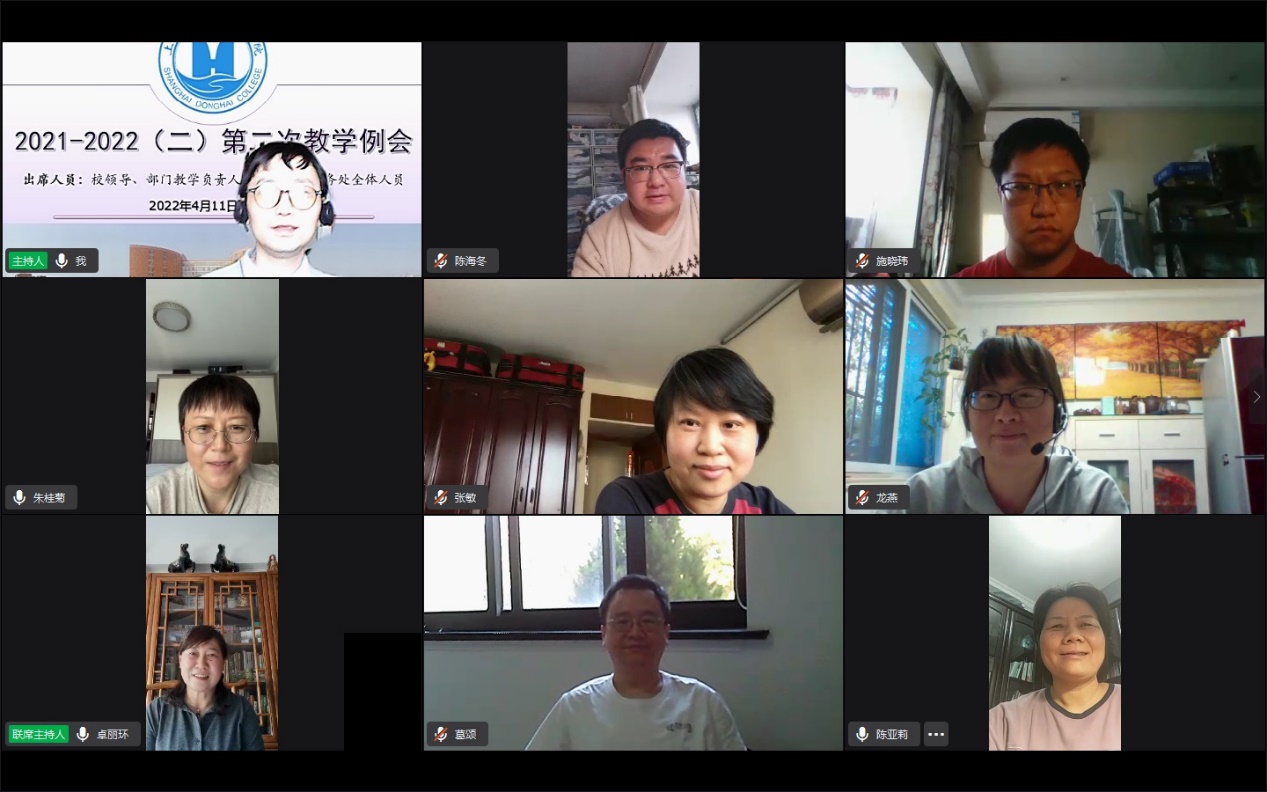 4月11日下午,学校召开了2021-2022学年第二学期第二次教学例会,副校长卓丽环、各学院部门教学负责人及教务员、教务处相关人员参加会议,会议以视频会议方式进行,教务处处长张居阳主持会议。