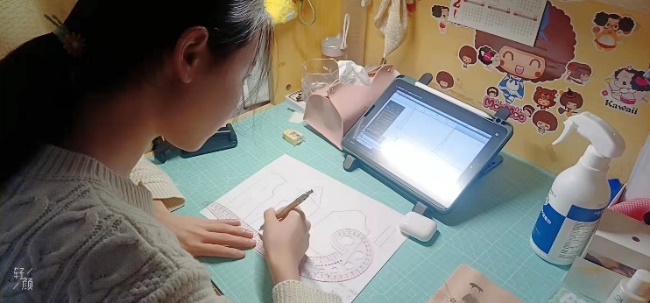为了让我们更好的适应网课,老师选择了“减法立裁”。减法立裁和我之前接受的知识是完全不一样的,在此之前我接受的是要严谨准确,而线上的网课更要求我们在掌握一定方法的前提下有创意。我们虽说上网课多有不便,但老师依旧负责,整个课堂充满趣味又不失学习的严谨,我们有任何疑问都可以得到及时地解决。 ——服装202班 马小艳