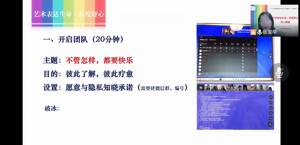 5月7日晚,心理中心邀请OH卡教练、国家二级心理咨询师、后现代咨询认证执行师、家庭教育高级指导师、上海高校心理咨询协会会员岳宝华,开展“艺术表达生命·抗疫舒心”的云团训,共有16位师生参与。岳宝华首先通过特别的破冰活动,让学生互相认识彼此,为后续彼此能敞开心扉做好铺垫。她随后分析了最近疫情的一些社会心理反应,回归到疫情中的每一位同学,鼓励他们用画画的方式来表达疫情的心理影响,并进行头脑风暴。最后,她带领大家做身体扫描,给学生提供了自我解压的渠道和方式。