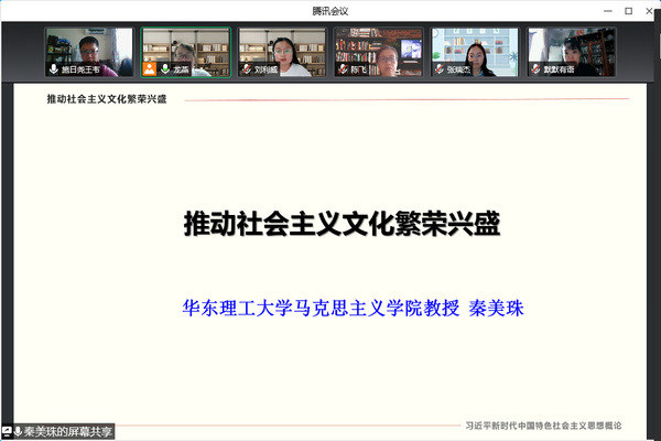 6月22日,社科部公民共建的项目云端“理论讲坛”第二弹开讲,此次特邀了华东理工大学马克思主义学院秦美珠教授,开展了《推动社会主义文化繁荣兴盛》的讲座,社科部主任龙燕主持,全体教师参会。