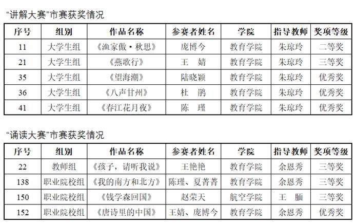 近日,上海市语言文字工作委员会公布了第四届中华经典诵写讲大赛(上海赛区)获奖名单。代表我校参赛的10件师生作品中,有9件在“诵读中国”经典诵读大赛(下文简称“诵读大赛”)和“诗教中国”诗词讲解大赛(下文简称“讲解大赛”)中获奖(详见下表),实现了“零的突破”;获“讲解大赛”二等奖的学生学前205班庞博今,将携作品《渔家傲•秋思》代表上海参加全国赛,为本赛项唯一入围全国赛的上海高职院校选手,实现了“质的飞跃”。