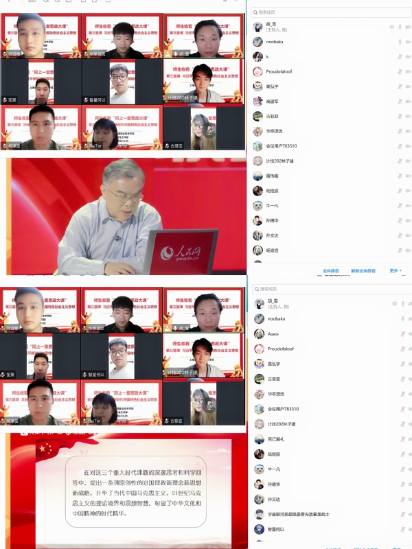 首先,主讲人讲述习近平新时代中国特色社会主义思想的内涵,是马克思主义与中国优秀传统文化相结合,以人民为中心解决主要矛盾的发展理念,“五位一体”总体布局、“四个全面”战略布局,发展动力是全面深化改革,全面从严治党的政治保证。其次,中国抗击疫情决策迅速,由党中央集中统一领导,始终以人民服务为宗旨,强调了人民至上、生命至上的价值取向。最后,全党全国各族人民共同努力下,我国脱贫攻坚战取得了全面胜利。通过一小时的学习,师生讨论热烈,表达自己感悟。