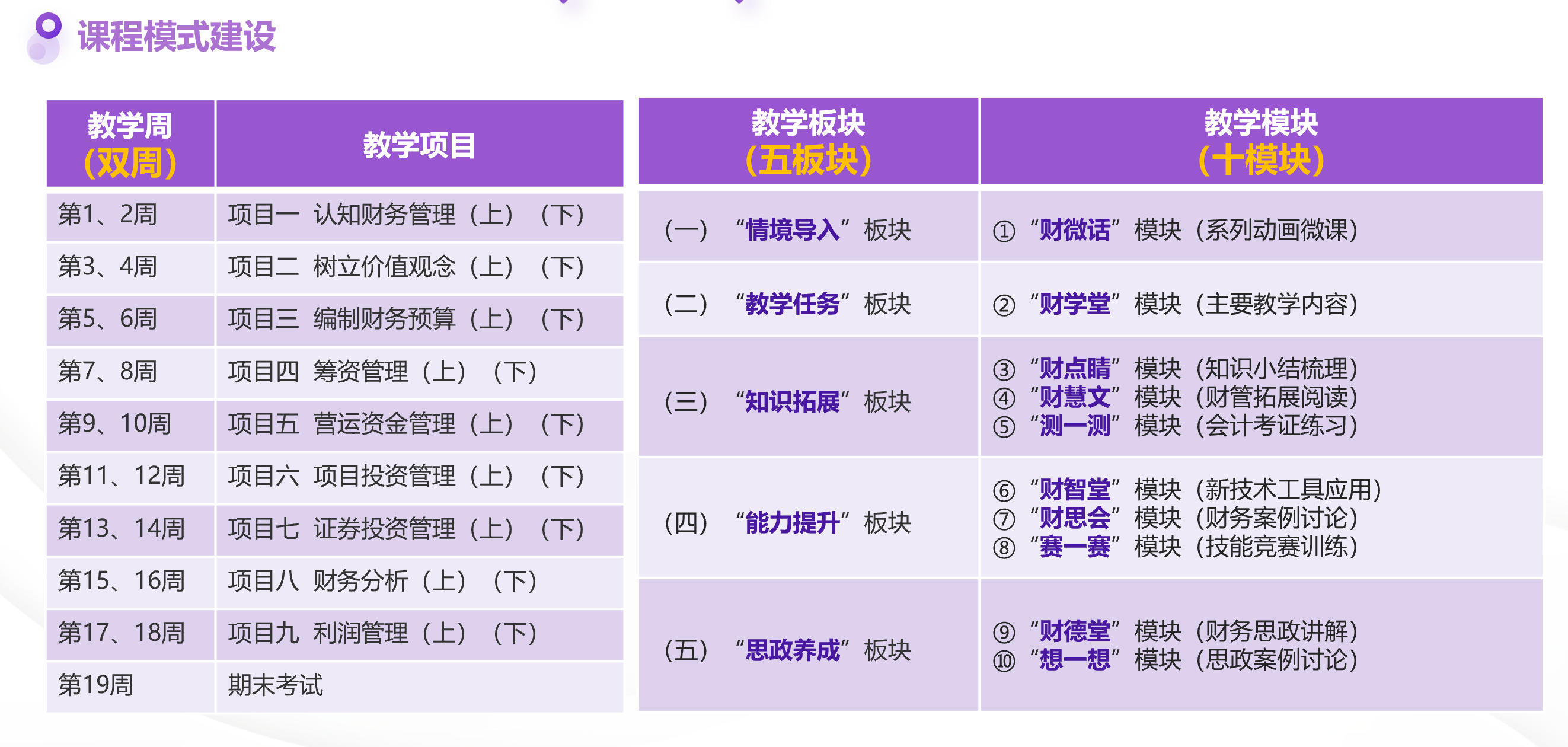 《财务管理》课程的设计基于高职学生学情,适应职业教育人才培养的需要,依据最新行业发展的方向,面向小微企业财务管理能力的培养,将课程内容分为九大项目,开展“双周五板块十模块”的教学活动。