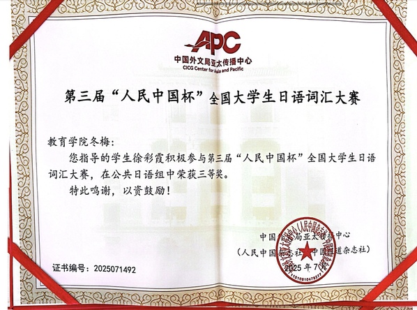 在日语教研室教师的细致指导下,同学们深入钻研词汇用法,在比赛中展现出良好的学术词汇运用能力。指导教师亦荣获“优秀指导教师奖”,这既是对教师个人教学水平的肯定,也是对教育学院日语教学团队工作的认可。