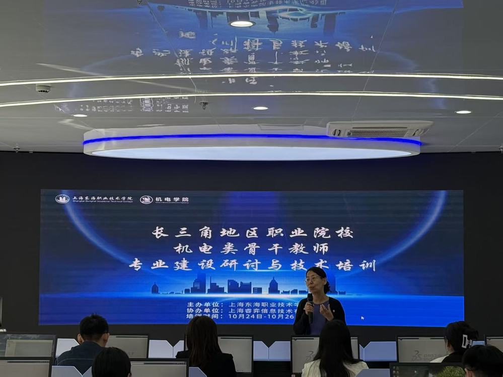 为深入贯彻落实国家关于推动长三角一体化高质量发展和现代职业教育体系建设的战略部署,提升区域职业院校机电类专业教师的“双师”素养与前沿技术应用能力,上海东海职业技术学院机电学院依托上海市民办高校教师专业发展中心东海学院分中心、国家示范性智能制造虚拟仿真实训基地,于10月24日至10月26日举办了为期3天的“长三角地区职业院校机电类骨干教师技术培训”。来自上海、江苏、浙江等职业院校的50余名教师参加本次培训,东海学院校长贺瑛教授到现场看望参培教师并致辞。贺瑛表示,发展新质生产力是推动我国高质量发展的重要着力点。职业教育作为高素质技术技能人才培养的主阵地,必须紧扣新质生产力发展需要,促进教育、科技、人才三者有机衔接、深度融合。打造与新质生产力相匹配的新型人才队伍,关键在于建设一支具有创新能力的“双师型”优秀教师队伍,从而将专业教育与学生创新思维培养、创新能力提升和创新活动开展紧密融合,真正成为培养大国工匠的“良匠之师”。她希望全体参训学员珍惜此次培训机会,做到学有所获、学以致用,通过将创新理念、实训教学与专业课程深度融合,为培养更多高素质创新型应用人才贡献力量。