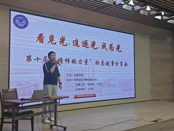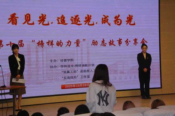 “看见光,追逐光,成为光”,10月28日,由经管学院主办,学林逐光:榜样领航计划、“筑翼工坊”资助育人工作室、“东海同舟”工作室、思润社联合协办的第十届励志故事分享会在匠兴苑报告厅圆满落幕。本次分享会以“榜样的力量”为核心主题,特别邀请会计237班徐婉琪、关务234班齐悦鑫两位优秀同学,为大一新生分享成长经历、学习方法与发展规划,助力大一新生在求学路上明确方向、砥砺前行。