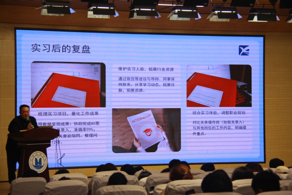 在实习准备指导环节,朱作人结合企业招聘经验,给出实操性建议。他提醒同学们,实习前应明确职业目标,提前了解目标企业业务领域与企业文化,针对性地补充相关知识;实习过程中要保持谦逊态度,主动向一线员工学习,注重细节积累与经验沉淀,同时勇于尝试、敢于担当,将理论知识转化为实际操作能力。“实习不是简单的‘打杂’,而是发现自身不足、找准职业定位的关键阶段,要珍惜每一次实践机会,做到在实践中成长,以坚持成就专业。”他的叮嘱让在场同学深受启发。
