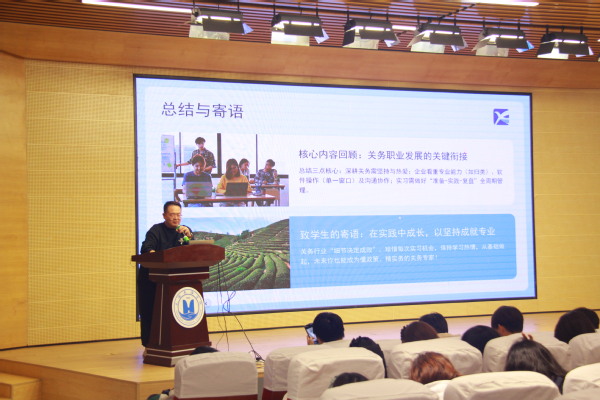 朱作人深耕报关行业20年,带领团队在进出口合规管理领域积累了丰富经验。在分享会上,他以“坚守初心赴山海 以技立身行致远”为核心,结合自身从业经历与行业发展趋势,为同学们带来全方位职业指导。