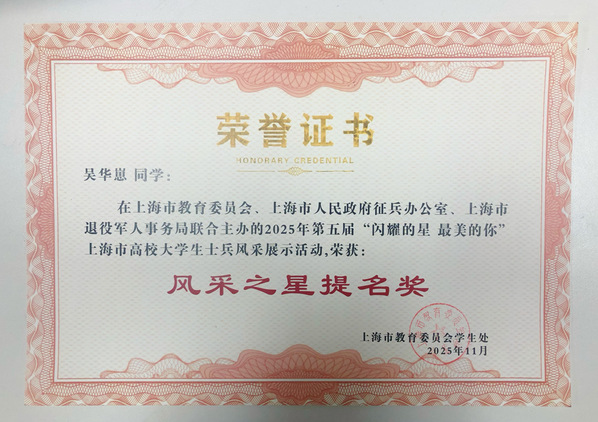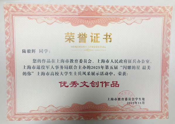 11月19日下午,由上海市教育委员会、上海市人民政府征兵办公室、上海市退役军人事务局联合主办的2025年第五届“闪耀的星 最美的你”上海市高校退役大学生士兵风采展示活动总结表彰大会在上海大学举行。我校国旗护卫队荣获“风采团队”奖,退役大学生士兵吴华崽荣获“风采之星”提名奖,艺术设计学院陆毅辉同学的作品《并肩》荣获“优秀文创作品”奖,充分展现了东海学子投身国防、砥砺奋进的精神风貌与卓越风采。