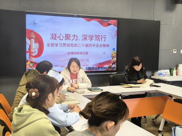 为深入学习贯彻党的二十届四中全会精神,切实把全院教师的思想和行动统一到全会精神上来,护理学院党支部于11月19日中午举办以“凝心聚力,深学笃行—深入学习贯彻党的二十届四中全会精神”专题学习活动。护理学院院长张美琴、全体教师出席本次活动,学院党支部书记彭艳主持。