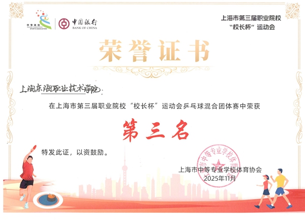 11月22日至23日,由上海市教育委员会指导,上海市中等专业学校体育协会、中国银行上海市分行主办,上海闵行职业技术学院承办的上海市第三届职业院校“校长杯”运动会在上海闵行职业技术学院成功举办。本届运动会汇聚了来自全市57所中职校、高职院校及教委直属单位的314名运动员同场竞技。我校校长助理张居阳,教育学院教师、教工乒乓球协会会长鲁续,后勤保卫处邓友君,艺术设计学院李莎和经管学院周建国、杨佳婉共同组成乒乓球赛代表队,参与了23日的乒乓球团体混合赛角逐,并经过激烈比拼,最终荣获该项目第三名的优异成绩,实现了历史性突破。