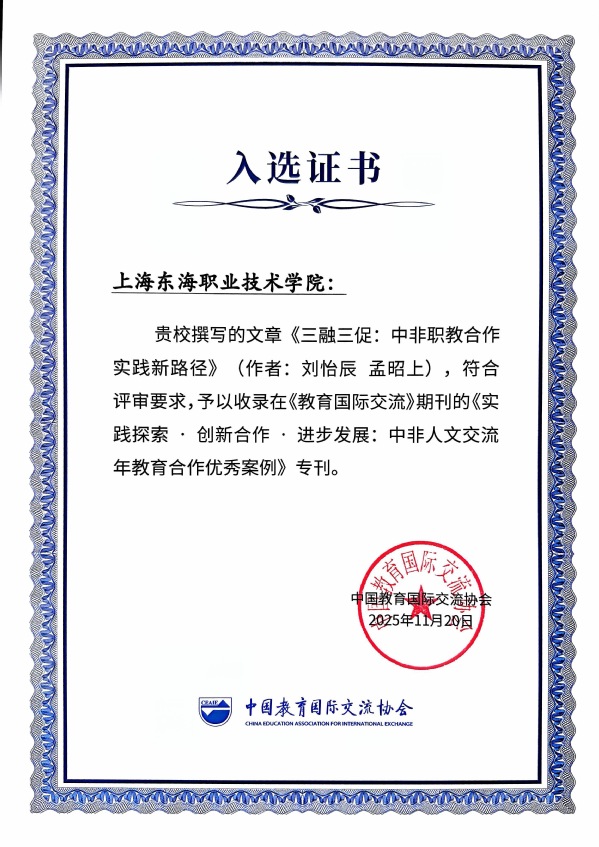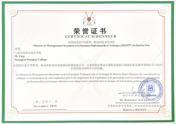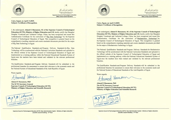 此外,东海学院还获得埃及高等教育与科学研究部技术教育顾问穆罕默德·瓦塔尼·穆罕默德·埃尔塞义颁发的埃及职业教育标准认证项目证书。