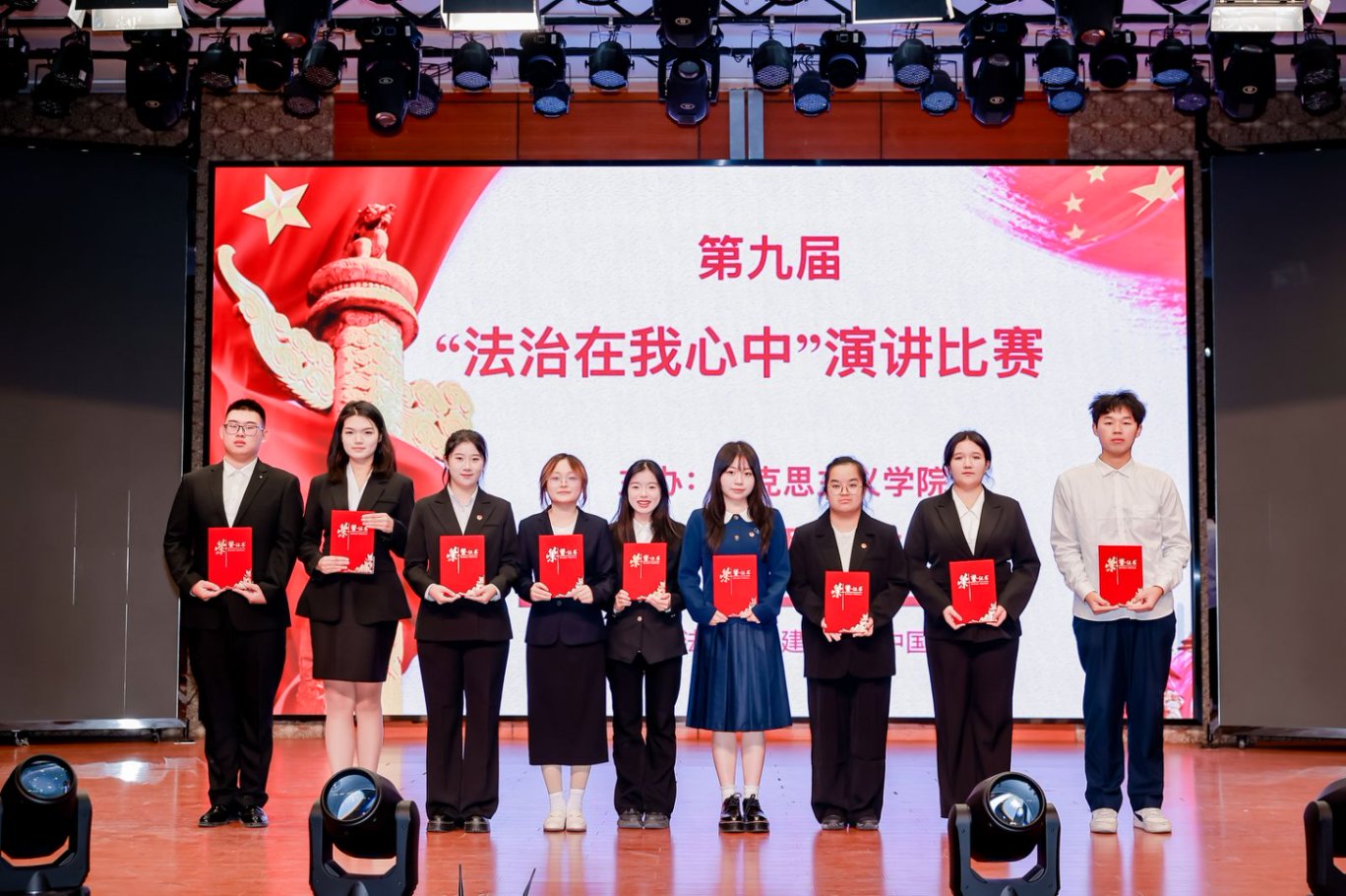 评委团由校领导及校外法律专家组成,依据演讲内容、语言表达、仪态风范、现场感染力等多维度严格打分、精彩点评。评委们高度肯定选手表现,称赞此次比赛是校园法治教育成果的生动展现,希望学子铭记法治初心,持续传播法治火种。经过激烈角逐,最终评选出特等奖一名、一等奖三名、二等奖四名、三等奖四名,校外法律专家与校领导登台为获奖选手颁奖,荣誉证书在舞台灯光下熠熠生辉,见证着他们的努力与成长。