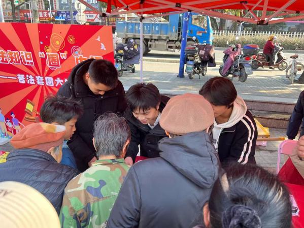社团志愿者耐心引导着现场参与者,为了让普法效果最大化,社团建立了“游戏+解读”的完整服务链条:每当有参与者套中奖品,负责知识讲解的志愿者就会立即上前,结合参与者此前填写的宪法知识点进行通俗解读,让群众在收获礼品的同时,理解宪法条文的内涵。活动期间,法学社的游戏区域始终人气旺盛,累计吸引数百名群众参与,发放礼品近200份,传递宪法知识点超50个。