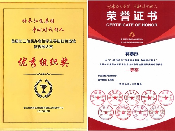 近日,“传承红色基因 争做时代新人”首届长三角民办高校学生寻访红色场馆微视频大赛颁奖仪式在上海杉达学院金海校区举行。我校在此次大赛中表现突出,共斩获一等奖3项、三等奖1项、优胜奖8项,学校荣获“优秀组织奖”,充分展现了我校学子的青春风采和红色教育成果。