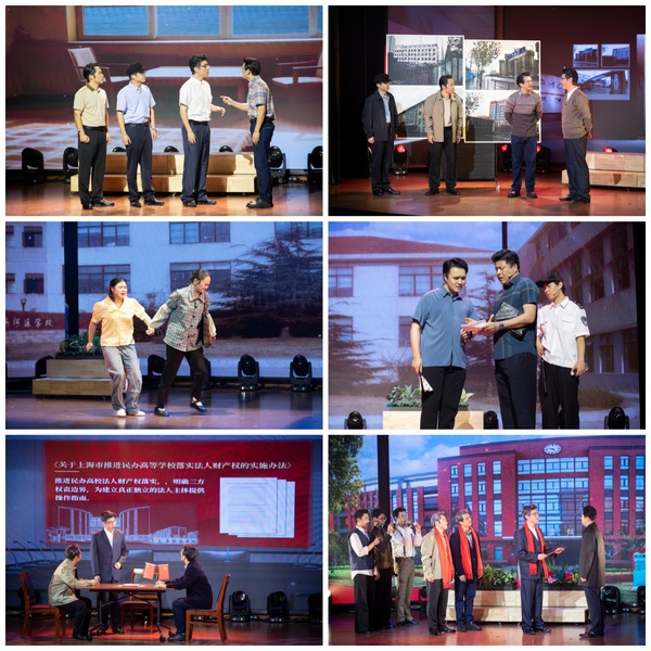 话剧从“淀山湖畔一锤定音”的序幕拉开,至“黄浦江畔书声琅琅”等场景徐徐展开,生动刻画了曹助我、姜至本、陶钧、李重华四位高校教师,怀抱“让多一个孩子上大学”“让多一个家庭得安宁”“让社会多一个合格的人才”的朴素初心,毅然投身民办教育事业的动人故事。在无校舍、无资金、无师资的“荒原”上,他们倾尽二十万元个人积蓄,点亮学子前程;历经七迁校址的颠沛,终在虹梅南路扎下根基。舞台上,办学举步维艰与落榜学子失望的目光,深深刺痛了举办人,也愈发坚定了他们破浪前行的决心。演员们真挚投入的演绎,深深打动了在场观众,引发强烈共鸣。