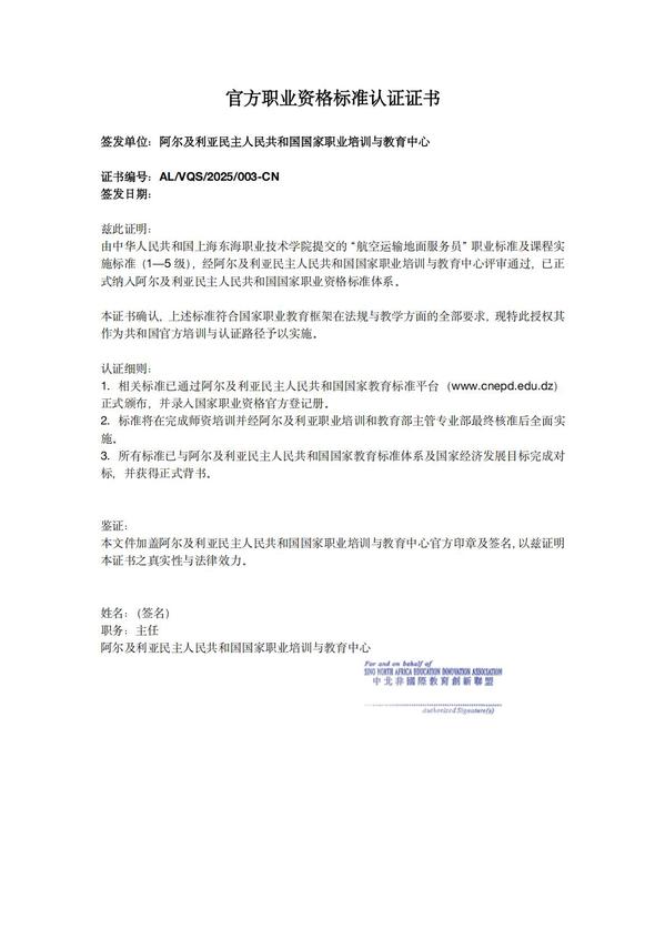 近日,航空学院提交的“航空运输地面服务员”职业标准正式通过阿尔及利亚国家职业资格认证,成功纳入该国国家职业资格标准体系。这是航院高职教育国际化进程中的重要里程碑,标志着航空学院在职业教育标准输出领域取得实质性突破。
