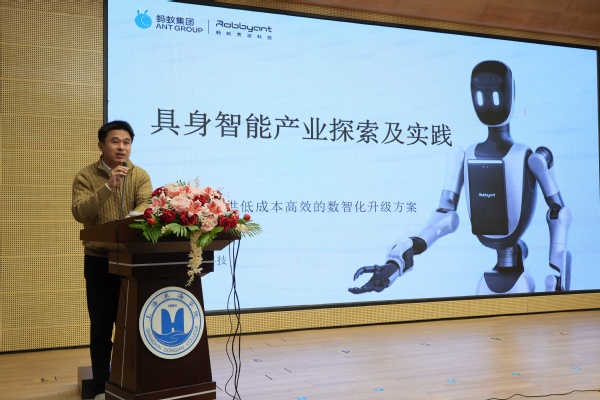 上海蚂蚁灵波科技有限公司刘宏言经理应邀作报告。他表示,蚂蚁灵波机器人不仅在餐饮厨房、文旅导览、康养管理、零售分拣、药品分拣、远程遥控等多个场景实现智能化服务,而且已成功探索以岗位技术技能要求为导向,构建教学体系、建设具身智能实训中心、建设课程体系等方面与教育有关的人工智能服务。未来,将与东海学院、国际文装紧密合作,共同推进“校企区”三位一体产教融合建设。