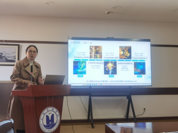 侯延华作课程实施汇报。她表示,《艺术鉴赏》线上课程已顺利运行一学期,课程资源丰富,有效提升学生审美素养,强化实践应用能力,教学反馈良好,学生参与率高达98%。刘伊丹对艺术疗愈微专业建设情况作介绍。目前疗愈空间工作室已逐步建立,与兄弟院校、企业建立合作关系,与医院、社区联动正在推进中。