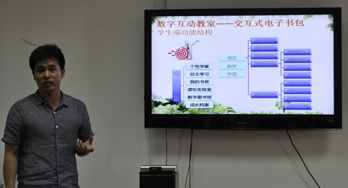 由上海华师东方数字出版有限公司和中国电信上海研究院组成电子书包项目联合团队正在逐步推出电子书包相关试验产品,并与我校开展合作试点,通过校企合作能让学生暑期勤工俭学,在高校内推行交互式电子书包。负责人通过与学生们的互动交流,并亲身示范电子书包相关产品的使用方法,亲切幽默的口气拉近与学生之间的距离并让学生们了解产品概况和到今后在其推销之中会遭遇的状况进行了讲解。