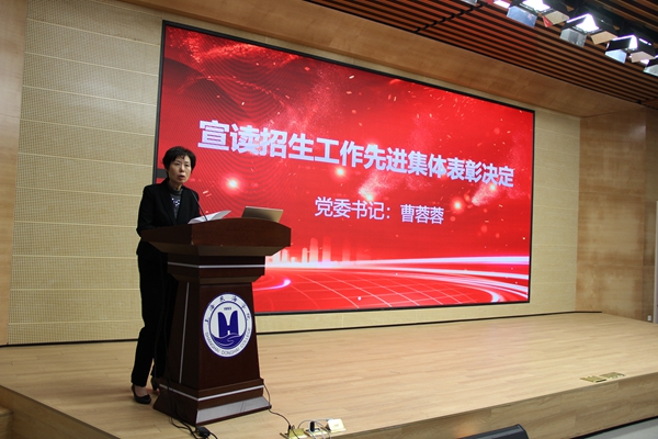 会议还表彰了一批在今年招生工作中表现突出的先进集体,党委书记曹蓉蓉宣读《关于表彰2020年招生工作先进集体的决定》。校长王刚、党委书记曹蓉蓉为获得“先进集体”荣誉称号的传媒学院、护理学院、教育学院和机电学院颁奖;接着,校领导们为全校7个二级学院颁发招生工作奖励。