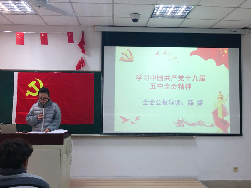 学习会分为两个议程,一是学习精神,二是支部书记讲党课。在第一个议程中,与会党员与学生干部共同学习了中国共产党十九届五中全会精神和习近平总书记在浦东开发开放30周年庆祝大会上的重要讲话精神。由支部委员薛娇和支部委员卢桃分别就讲话精神进行导读。