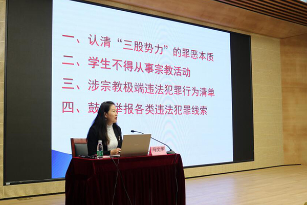 马文华从认清“三股势力”的罪恶本质、学生不得从事宗教活动、涉宗教极端违法犯罪行为清单、鼓励举报各类违法犯罪线索四个方面详细阐述了作为当代大学生该如何自觉抵御“三股势力”,该如何在三年的大学生活中保护好自己。她通过列举九种关于涉宗教极端违法犯罪行为,告诫学生要认清宗教极端思想的真面目,如遇到涉嫌宗教极端和恐怖主义的违法犯罪行为要坚决制止。最后,马文华希望学生们加强意识形态建设,争做综合素质高、政治立场坚定、全面发展、有理想、有追求、有责任、敢担当的合格大学生。