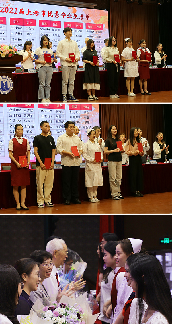 党委书记曹蓉蓉宣读上海市优秀毕业生、校优秀毕业生表彰决定,校领导分别为优秀毕业生代表颁发荣誉证书,同时为各学院毕业生代表颁发毕业证书。