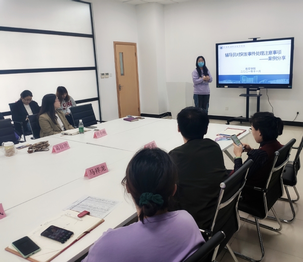 在11月2日学生工作部组织召开的心理工作案例研讨会上,经管学院、航空学院学办主任先后分享了工作实际案例,包括案例详细情况,辅导员、学院应对举措,及案例思考。接着,社科部《大学生心理健康教育》课程负责人岳宝华,心理健康教育与咨询中心单琦就案例情况展开分组讨论,并对辅导员们工作中遇到困惑、难题进行答疑解惑,提供危机干预处理意见。