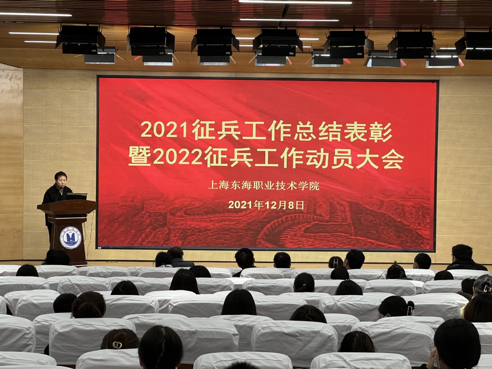 武装部长蒋久泉首先作2021年征兵工作总结,并对2022年征兵工作要求及注意事项做了说明。他说,东海学院已连续10年被上海市评为征兵工作先进单位。2021年,在学校党委和征兵工作领导小组的领导下, 43名学生被闵行区征兵办批准入伍,其中,应届毕业生为25人,占入伍总人数的58.13%,超过上海市征兵办要求的40%比例。