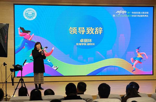 在颁奖环节,上海东海职业技术学院副校长卓丽环在致辞中表示,感谢MJstyle对本次大赛的大力支持,电商直播是数字化时代的产物,也是职业院校电子商务专业建设的课程内容之一。东海学院本着服务地方经济、助力上海市全球电子商务中心城市建设,推动上海直播高地发展,将直播过程的新技术、新模式引进课堂,为学生提供新行业、新技能和新机会。搭建校企合作平台,开展深度校企合作,形成完整的教育、实训、孵化、就业和创业闭环,支持学院学生灵活创业、稳步就业,着力培养学生创新精神和实践能力,培养面向未来的复合型电商新经济人才。