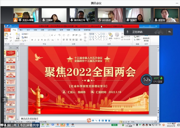 3月18日,社科部教师们虽然都被封控在各自小区,但学习的热情不减,在周五下午通过腾讯会议的形式组织开展了“聚焦2022全国两会”的学习会。学习会由主任龙燕主持,施晓玮老师领学,全体教师参加。