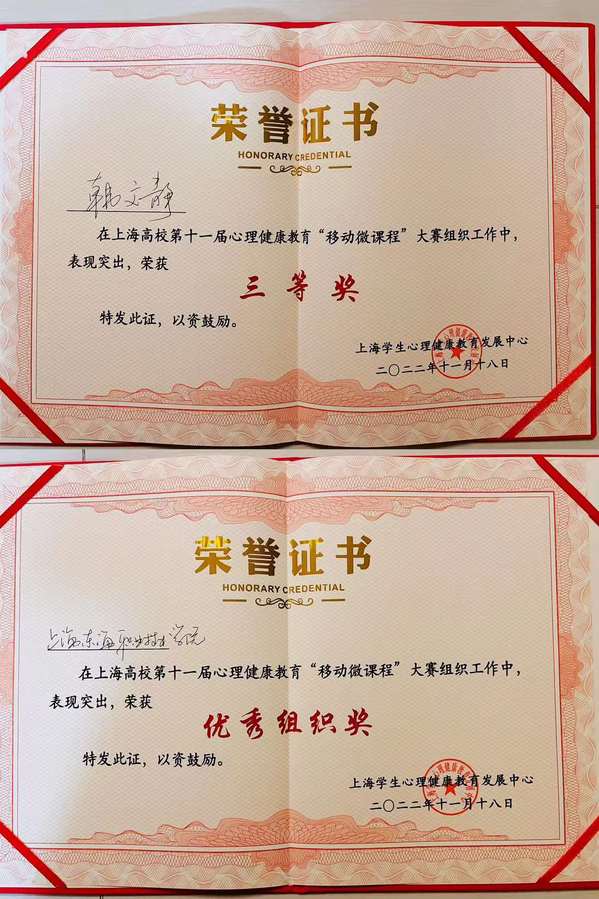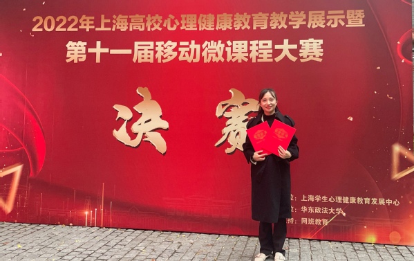 11月18日,第十一届上海高校心理健康教育“移动微课程”大赛决赛在华东政法大学(长宁校区)顺利举行,我校辅导员韩文静老师以总分第五名的成绩,荣获三等奖,同时获得优秀组织奖。